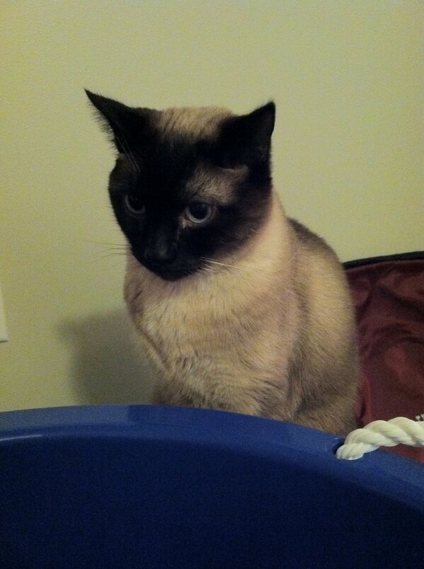 I call this: Siamese contemplates enormous bucket.