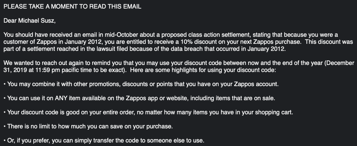 so... this class-action settlement for Zappos letting themselves get hacked and revealing my personal and financial information is -- i'm allowed to give them more money?