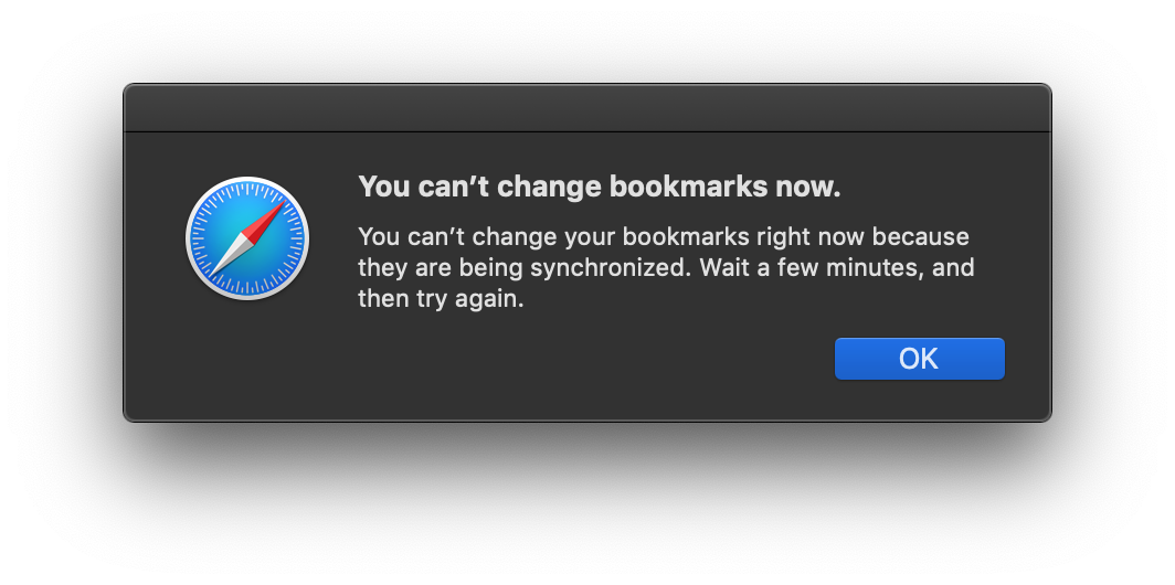 The best part of iCloud syncing your bookmarks is never being able to bookmark anything, even locally, because this message constantly