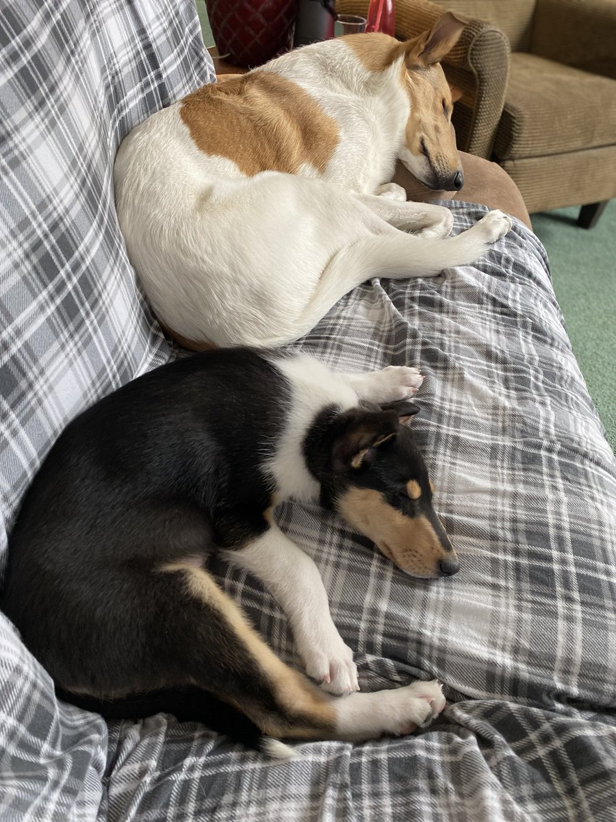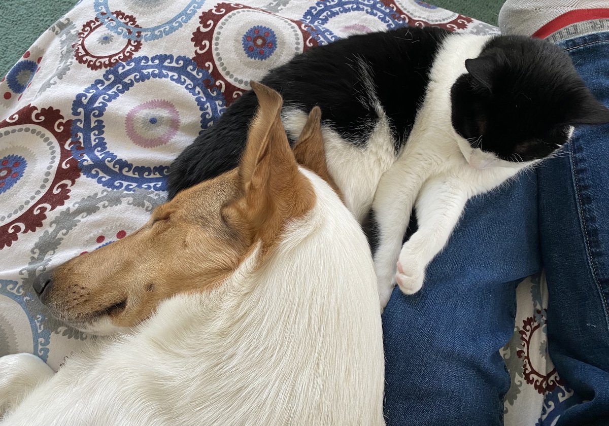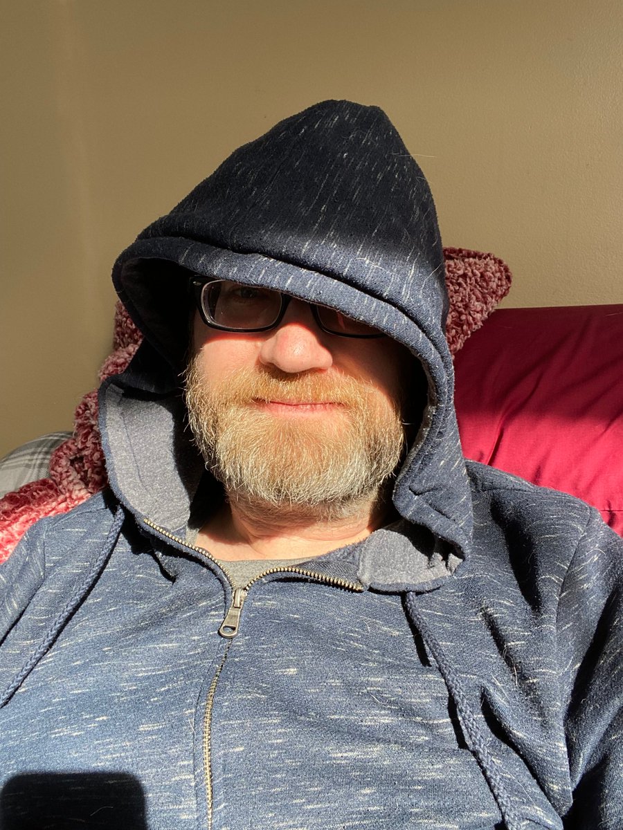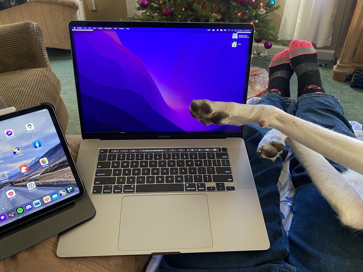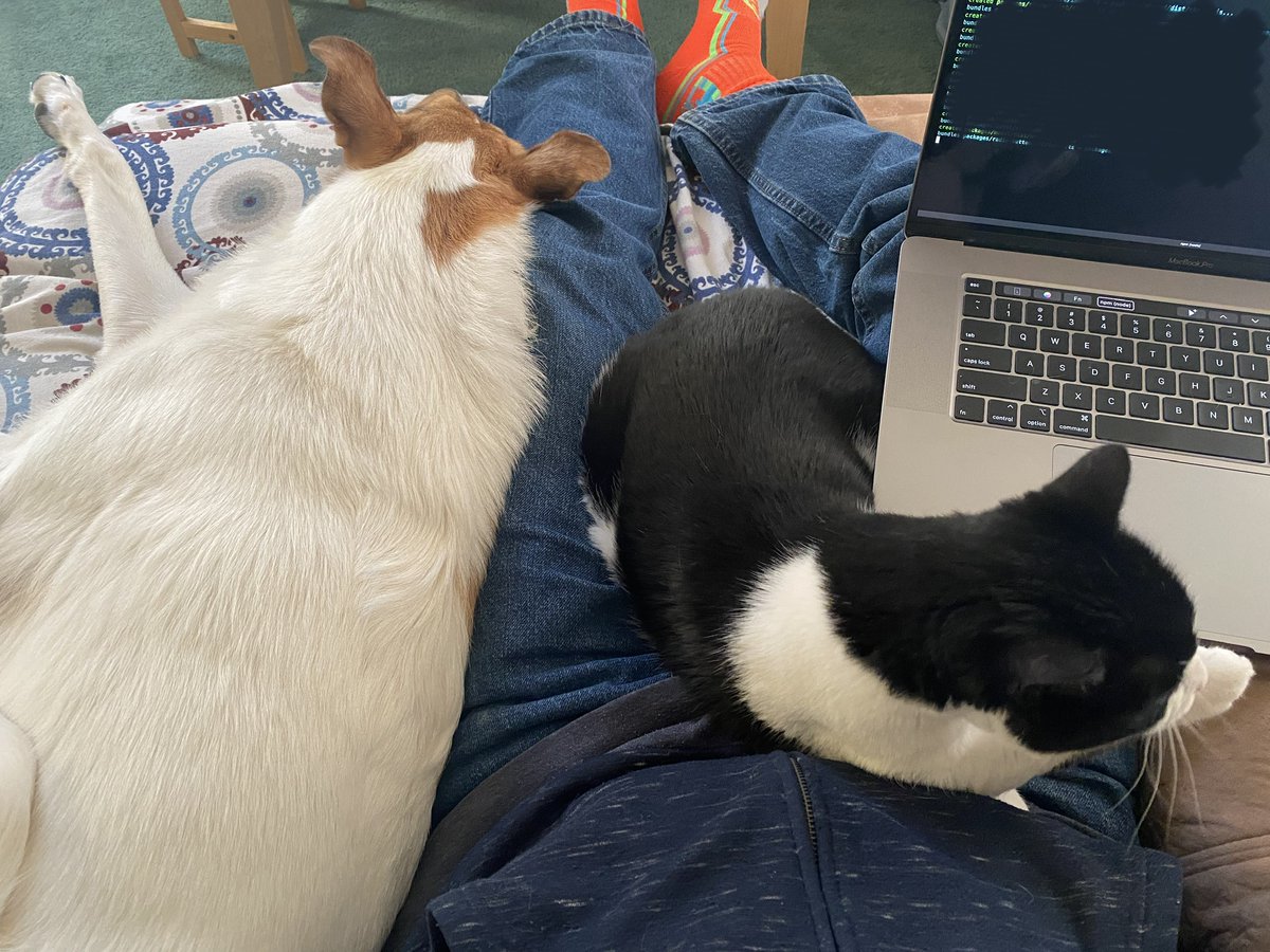 working from couch, supervising puppy. sleeping dog on my left leg. i forgot to grab a hat before i sat down.