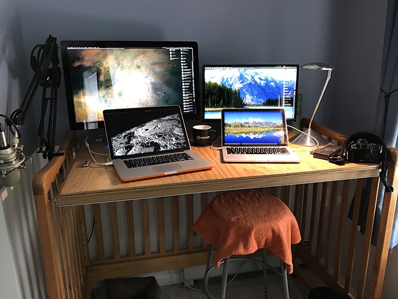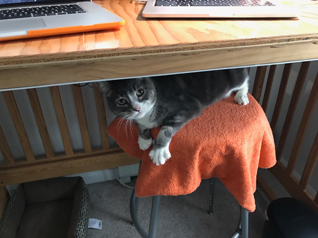 don’t know if i posted this before - this is my standing desk, made from old drop-side crib. moved the bed platform up, glued plywood to it.